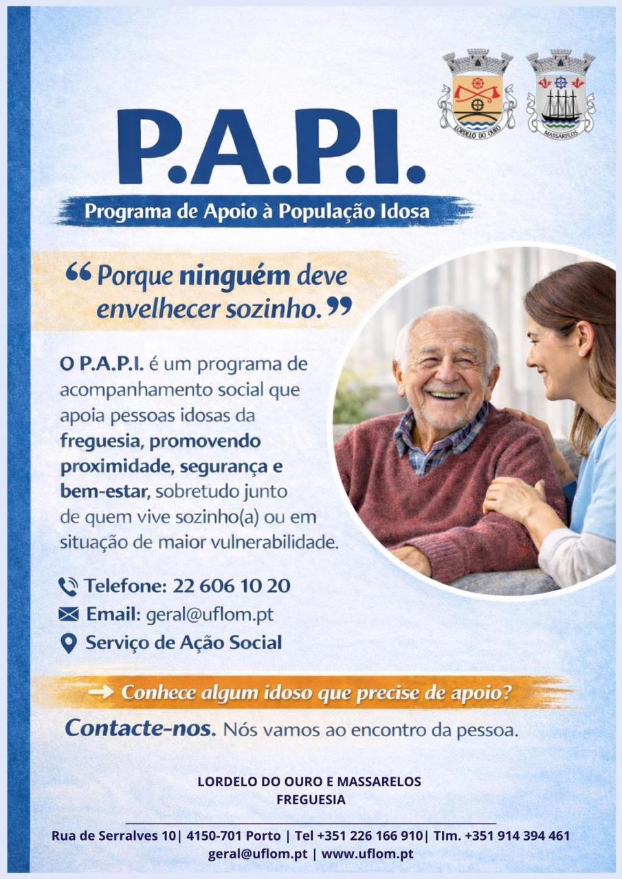 O P.A.P.I. é um programa da União de Freguesias de Lordelo do Ouro e Massarelos dedicado ao acompanhamento e apoio a pessoas idosas da nossa comunidade. Esta resposta social pretende promover segurança, bem-estar e proximidade, especialmente junto de quem vive sozinho(a) ou se encontra em situação de maior vulnerabilidade.