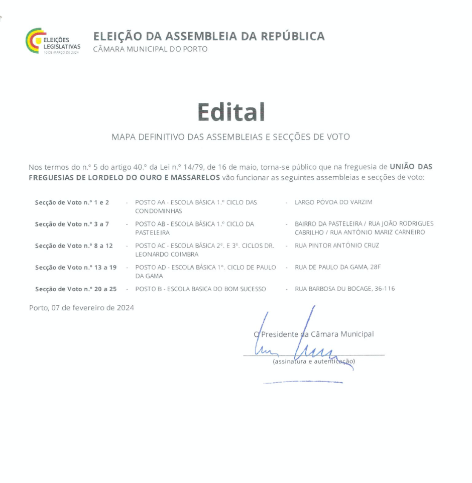 A Assembleia de Voto da freguesia da União das Freguesias de Lordelo do Ouro e Massarelos foi desdobrada em 25 secções de voto.